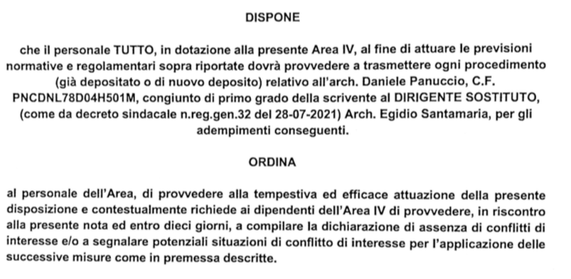 Proprio le leggi e i regolamenti sull’anticorruzione a garanzia del buon andamento e imparzialità della pubblica amministrazione individuano dunque i casi di conflitto d’interesse per i dipendenti pubblici. La 241 del 1990 così come modificata dal dPR numero 62 del 2013, stabilisce che il dipendente si astenga «dal prendere decisioni o svolgere attività inerenti alle sue mansioni in situazioni di conflitto, anche potenziale, di interessi con interessi personali, del coniuge, di conviventi, di parenti, di affini entro il secondo grado». E anche che il dipendente si astenga «dal partecipare all’adozione di decisioni o ad attività che possano coinvolgere interessi propri, ovvero di suoi parenti, affini entro il secondo grado, del coniuge o di conviventi, oppure di persone con le quali abbia frequentazioni abituali». Limiti di legge che Zizzari si è autoattribuita con l’ordine di servizio da lei stessa sottoscritto, assunto al protocollo generale dell’Ente numero 0071980 del 30 luglio 2021, dieci giorno dopo la sua nomina a dirigente avvenuta con decreto sindacale del 20 luglio.