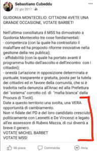 Un brutto pezzo che già denotava la propensione del personaggio diventato deputato all’offesa da rivolgere agli avversari. Avrebbe replicato quale giorno fa contro Alfonso Masini, il candidato sindaco del centrodestra di cui Cubeddu pubblicamente ha detto è «un vecchio matusalemme, elefantiaco», alludendo all’età (72 anni) e ai trascorsi di dirigente nella pubblica amministrazione comunale. Toro è diventato invece uno che «ha fatto il salto della quaglia». Che «ha tradito il M5S, i suoi valori ed il gruppo di Guidonia Montecelio con il quale è stato al governo della città – ha scritto Cubeddu -. Un signore che ha il coraggio pure di imputarmi incoerenza! Senza dimenticare la figura meschina che ha fatto insieme ad altri suoi accoliti nel formulare richieste per restare nel gruppo del M5S di Guidonia Montecelio».