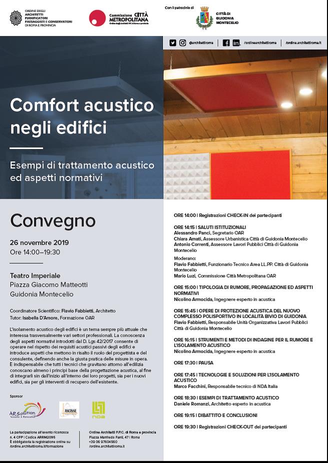 GUIDONIA – «Un convegno è una riunione di persone per discutere di argomenti di comune interesse» definisce il vocabolario. Nel caso in oggetto, «l’interesse comune» è limitato ai soli professionisti iscritti all’Ordine degli architetti che a vario titolo ruotano attorno al microcosmo comunale, quindi assessori, dirigenti, funzionari. Quello che si tiene oggi al teatro Imperiale, location pubblica e confortevole messa a disposizione dal Comune di Guidonia Montecelio, inizio ore 14.00, è semplicemente un corso per la formazione continua dei professionisti mascherato da convegno, a costo zero per la categoria. D’altro canto, un simposio su «Comfort acustico negli edifici. Esempi di trattamento acustico ed aspetti normativi» non è certo destinato ad attirare le masse, intese come cittadini che potrebbero sviluppare qualche forma di interesse verso l’argomento.