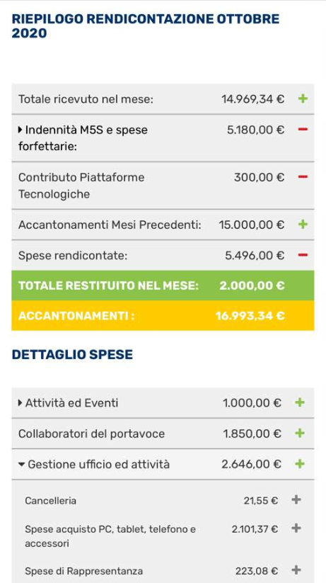 Intanto, lo spiegone per capire quanto danno indietro al partito e quanto trattengono per sé: i parlamentari del M5S restituiscono le indennità di carica aggiuntive come presidente di commissione, vicepresidente e inoltre restituiscono parte dello stipendio. I rimborsi spese della Camera o si utilizzano o si restituiscono. Lo stipendio di un deputato è composto da più voci: 5.000 mila nette, più 3.600 euro (per collaboratori ed eventi) e 3.600 euro per affitti e diaria, + altro fino a oltre 14mila euro al mese. Per i 5Stelle, però, al deputato devono bastare 3.000 euro per vivere. Il resto va speso o restituito. Il minimo da ridare è di 2000 euro al mese. A questi versamenti si aggiungono i 300 mensili per Rousseau. Il Nostro, come spende i soldi e quanto restituisce soprattutto dell’indennità variabile?