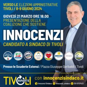 Tanti cittadini, aspiranti consiglieri, big della politica locale, regionale e nazionale del centrodestra, si sono stretti attorno al 55enne imprenditore che con lo slogan Tivoli Riparte ha presentato la coalizione che lo sosterrà nella campagna elettorale in vista delle elezioni comunali. Una alleanza costruita intorno a Marco Innocenzi dai partiti di Fratelli d’Italia e di Forza Italia e da sette liste civiche: «Coraggio Tivoli»; «Sguardo al Futuro»; «Amore per Tivoli»; «Laboratorio Tivoli»; «Aria Nuova»: «Innocenzi Sindaco» e «Partecipazione Popolare», lista che corre col simbolo del Partito Repubblicano Italiano.